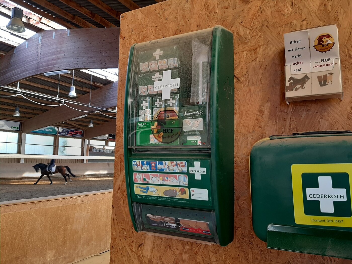 ERSTE-HILFE-AUSRÜSTUNG » ist Pflicht in jedem Stall! Sei es die große ERSTE-HILFE-Wandstation mit Augendusche und Pflaster-Spender oder ein mobiler ERSTE-HILFE-KOFFER mit extra Pflaster-Spender. Die kleine Pflaster-Tasche ist schnell mal mitgenommen. Hinweisschilder mit „Notfall- was ist zu tun“ mit nötigen Telefonnummern Arzt/KKH müssen sein! Cederroth ist bekannt für seinen hochwertigen Inhalt.